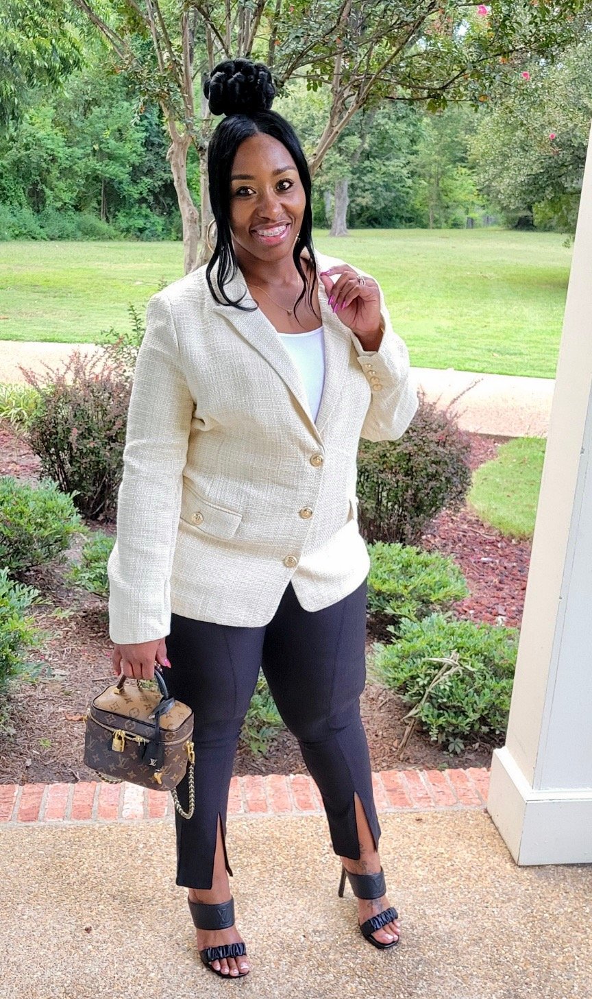 Relaxed fit tweed blazer jacket with peak lapel collar. Jacket features single breasted button down with decorative button flap pockets. Antique gold crest buttons adds a timeless look to the modern suit. Jacket is fully lined with a back slit for movement.